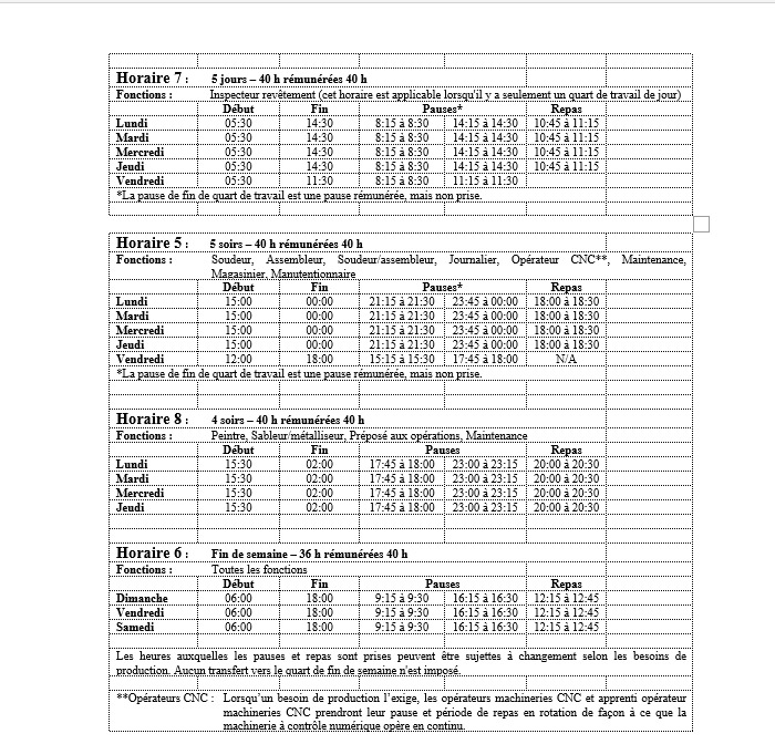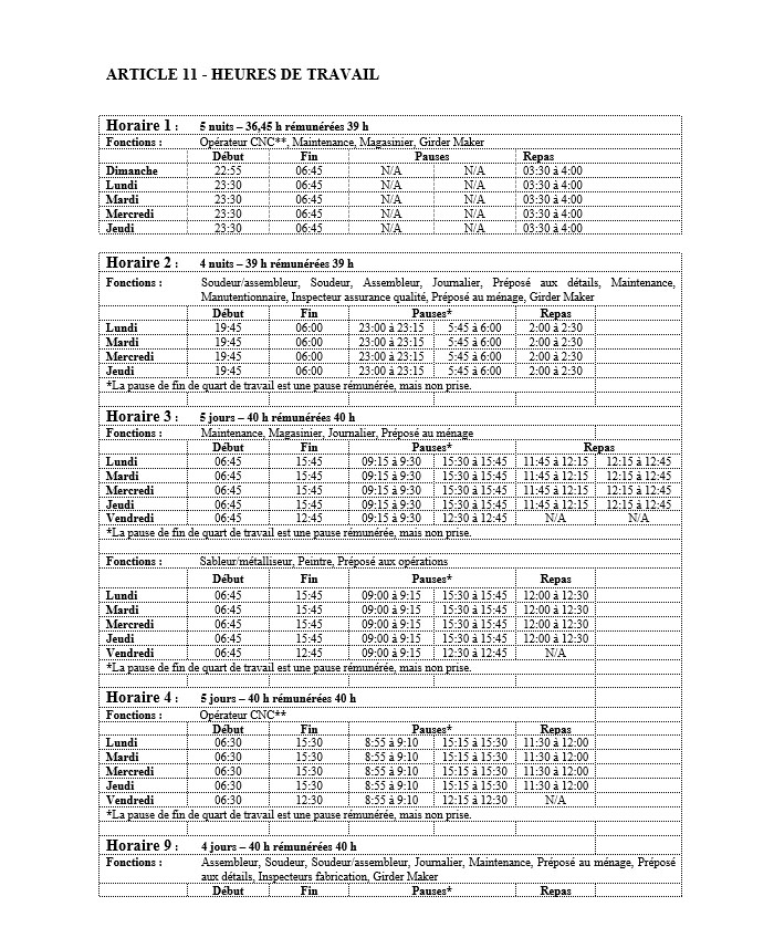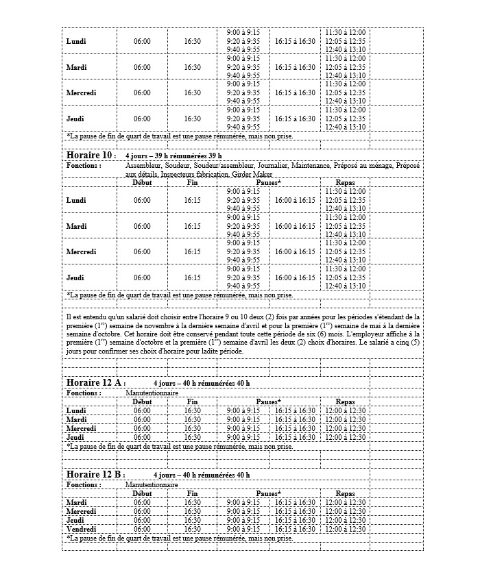 Pour la mécanique de transfert de quart pour les salariés du groupe de fonctions soudeur/assembleur, voir le tableau de l’annexe H.